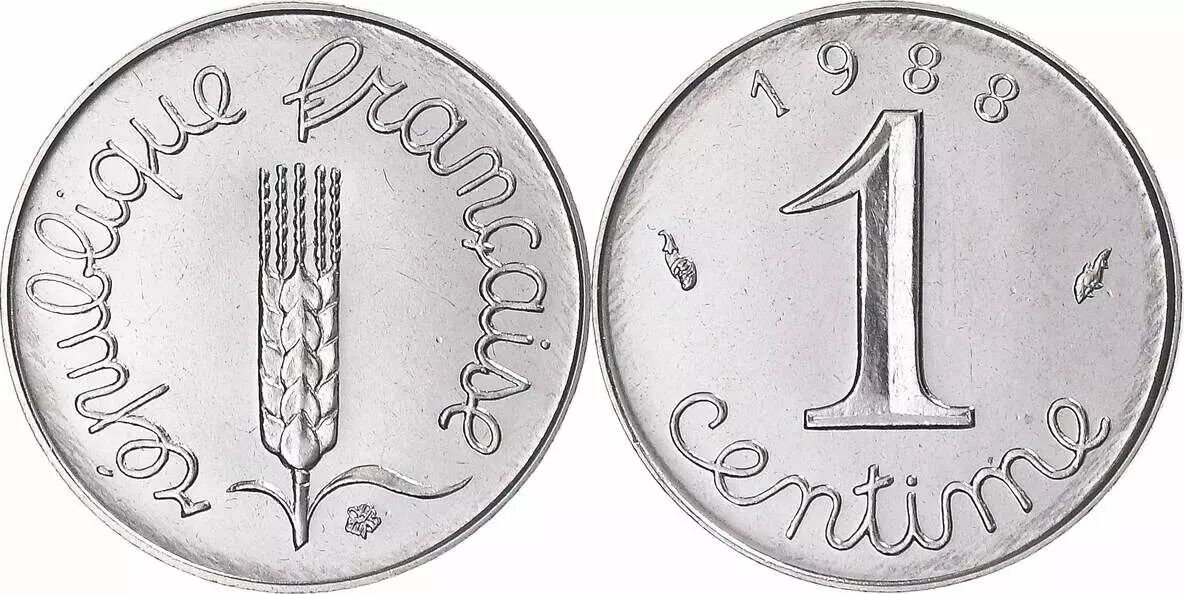 Cette pièce est un centime de franc français, datée de 1988. Elle a été frappée en acier.