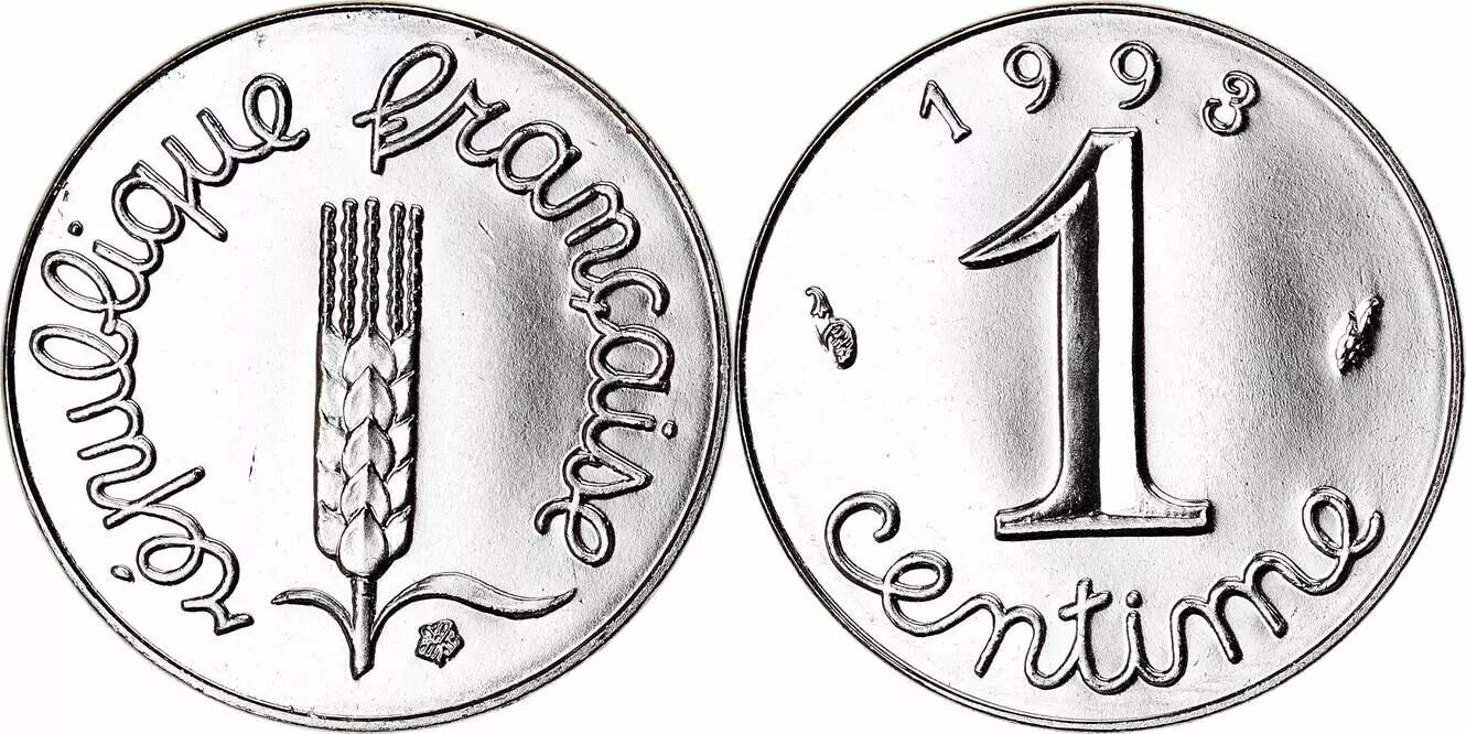 This coin is a French centime, dating from 1993 and minted with a Brilliant Uncirculated (BU) quality. It was produced in France. The face value of this coin is one centime.