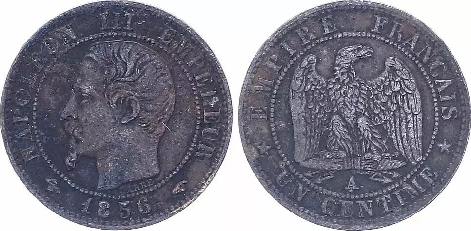 The coin is a one centime from France, issued in 1856 in Paris. It is struck in bronze and weighs 1 gram, with a diameter of 15 millimeters. The mintage of this coin is 2,828,167 copies.