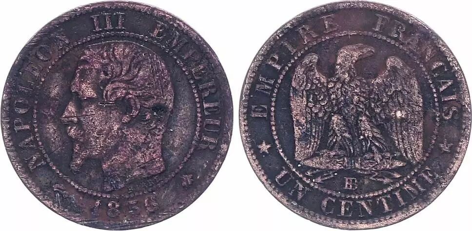 This French coin is a one centime of Napoleon III, minted in 1856 in Strasbourg. It is made of bronze and weighs 1 gram, with a diameter of 15 millimeters. The mintage for this year and mint amounts to 1,785,745 copies.