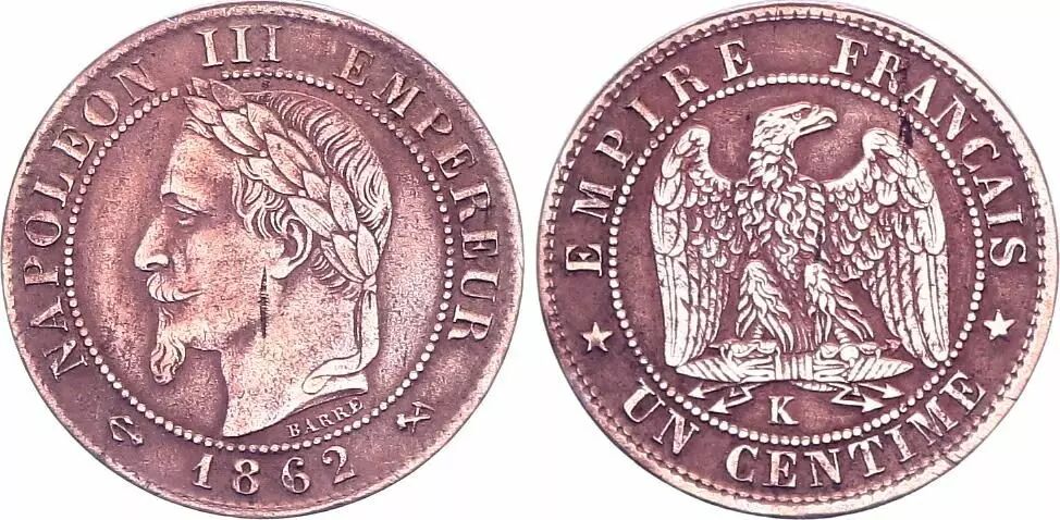 Cette pièce de monnaie française est un centime de franc, frappée en bronze, et datée de 1862. Elle a été produite par l'atelier de Bordeaux, identifié par la lettre "K". Son diamètre est de 15 millimètres et son poids est d'un gramme. Le tirage de cette pièce s'élève à 7 293 840 d'exemplaires.