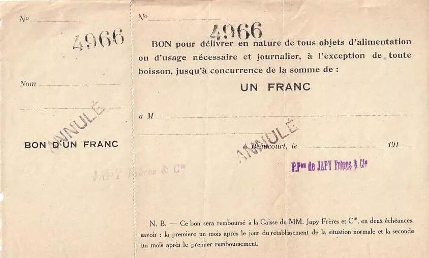 Banknote France 1 F Beaucourt Annulé