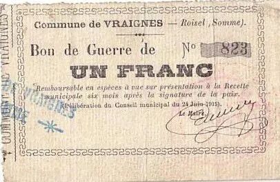 Billet France 1 F Vraignes Bon de guerre