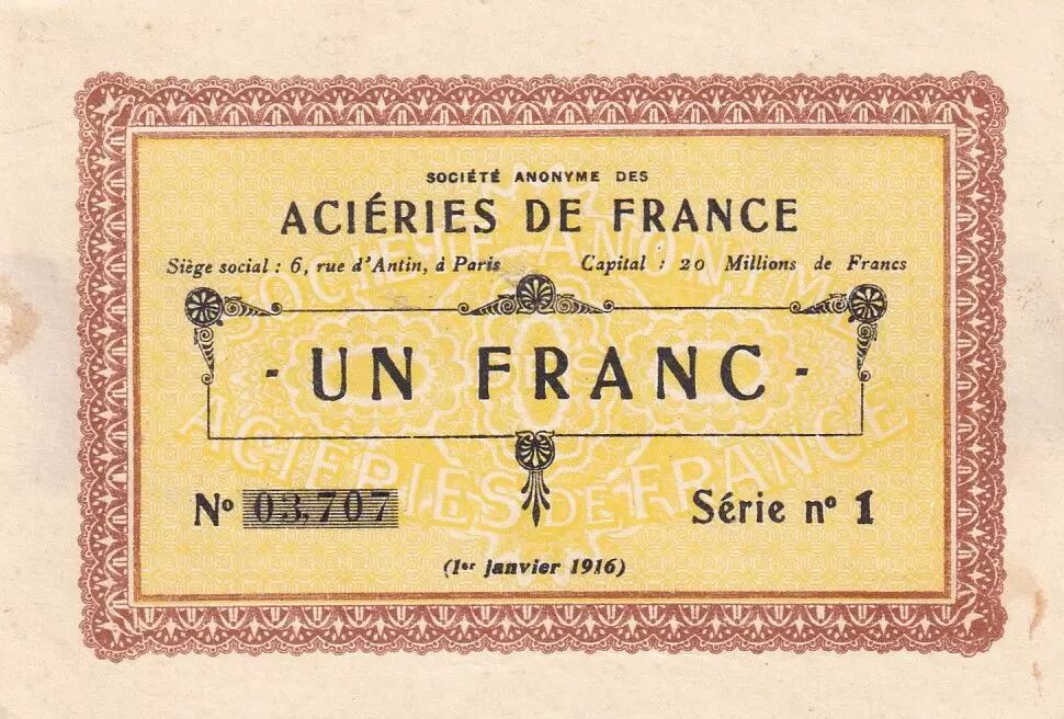 This emergency banknote, issued in France, represents a nominal value of 1 Franc. It was issued on January 1, 1916 by the Société anonyme des Aciéries de France.