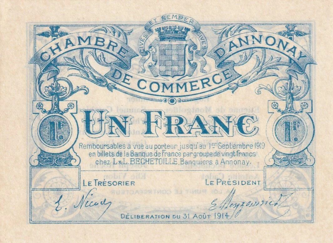 The 1 franc voucher from the Annonay Chamber of Commerce dated August 31, 1914 belongs to the unissued emergency currency projects developed in the very first days of World War I. As early as August 1914, the sudden disappearance of small change led many cities to prepare emergency local issues.