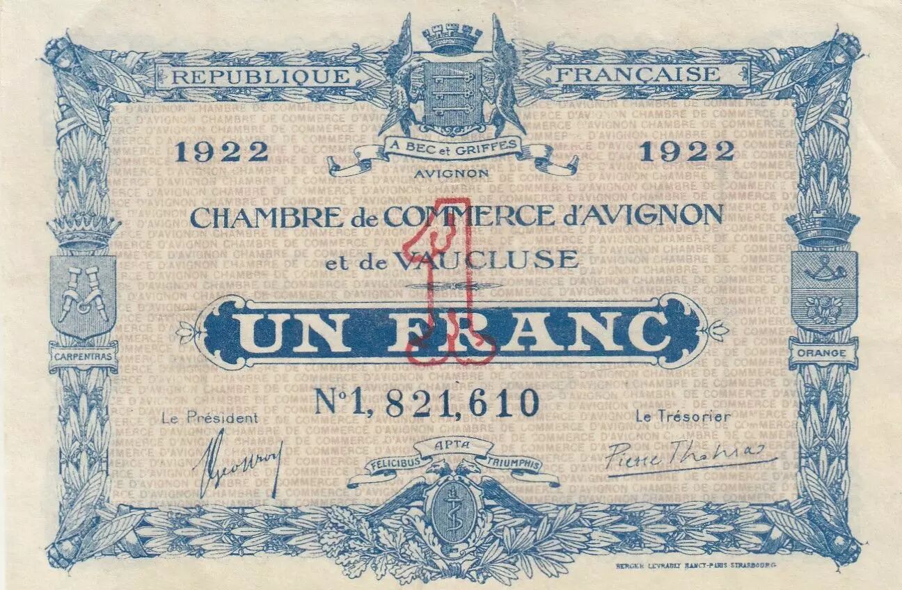 This French banknote was issued by the Avignon Chamber of Commerce in 1922. It represents a nominal value of one franc. This type of banknote was common in France at the beginning of the 20th century, issued by various local chambers of commerce to facilitate regional economic transactions.