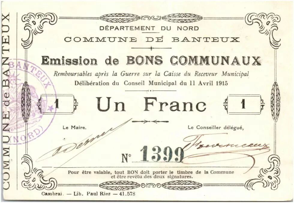 Banknote France 1 Franc Banteux City - 1915