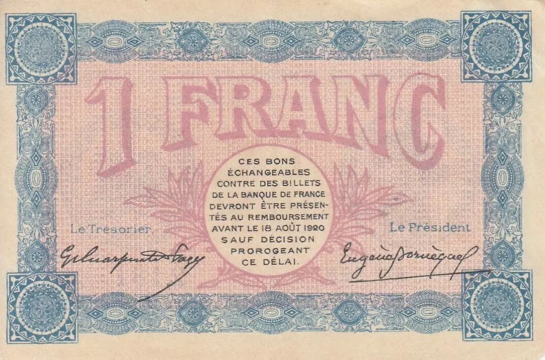 The one-franc banknote issued by the Belfort Chamber of Commerce, dated August 18, 1915, is an example of emergency issues produced in France during the First World War. These local issues were intended to compensate for the shortage of fractional currency caused by the mobilization of precious metals for the war effort and by the hoarding of money by the population.