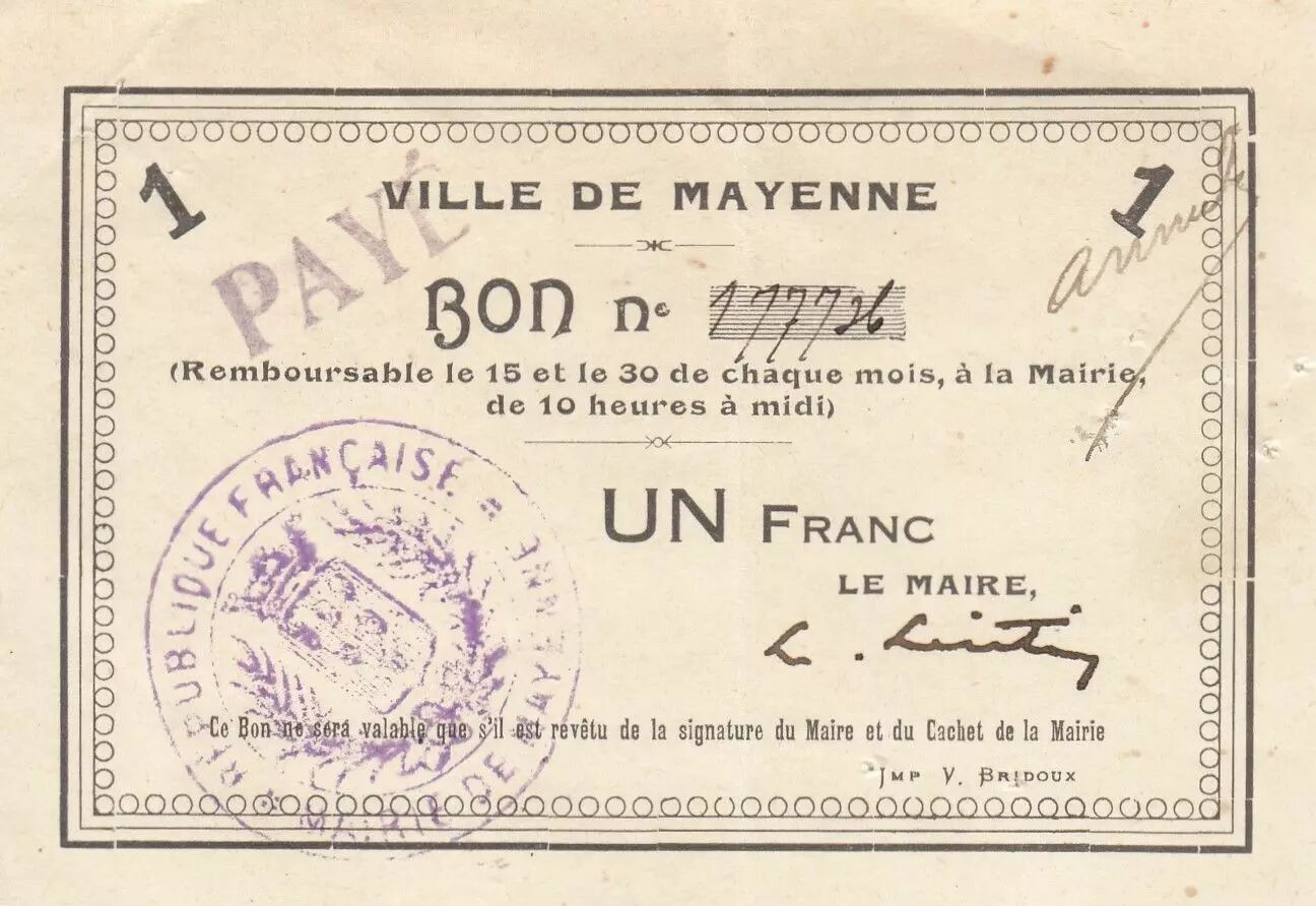 Billet France 1 Franc - Bon de la ville Mayenne