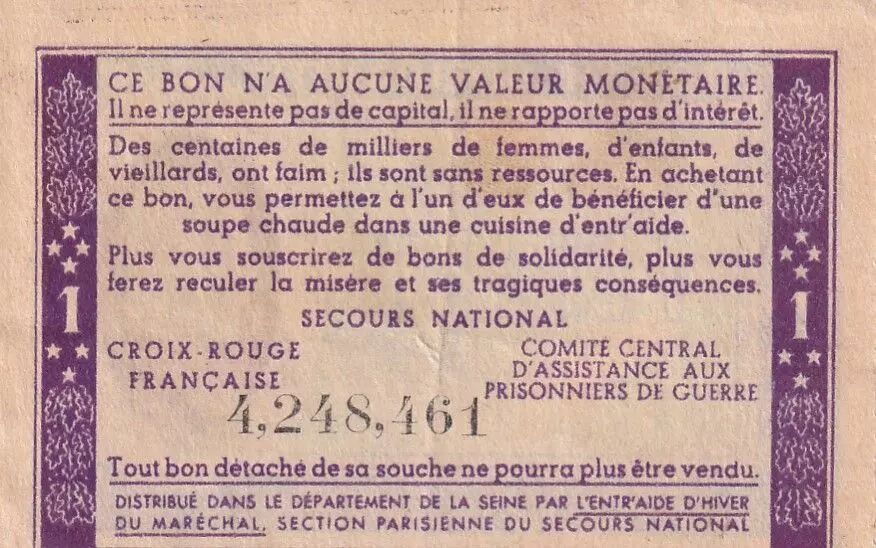 Accueil > Billets Français > Billets de Nécessités (1789-1945) > 1939-1945 > France 1 Franc Bon de Solidarité - 1941-1942 - Sans série