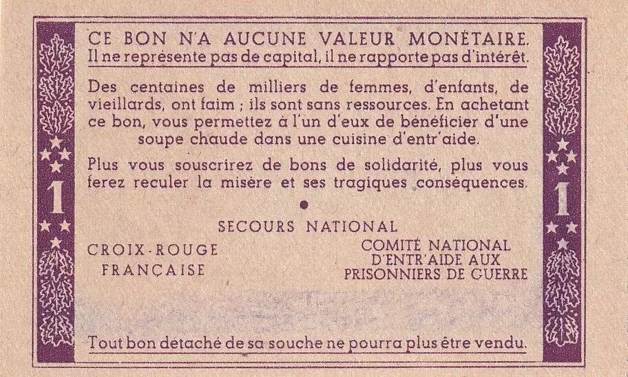 Accueil > Archivage > France 1 Franc Bon de Solidarité Pétain - Bol de Soupe 1941-1942