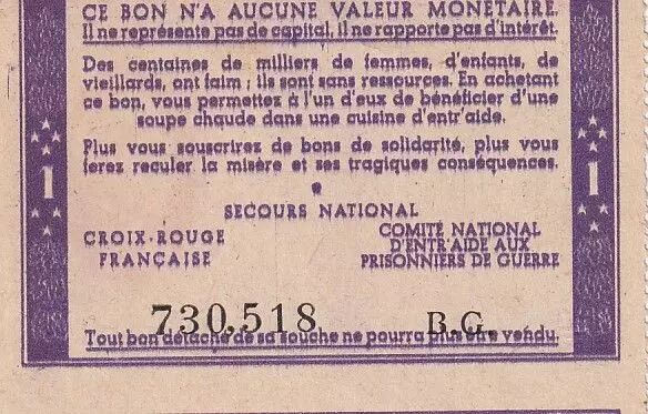Accueil > Archivage > archivage-Billets Français > France 1 Franc Bon de Solidarité Pétain - Bol de Soupe 1941-1942 - Série BG