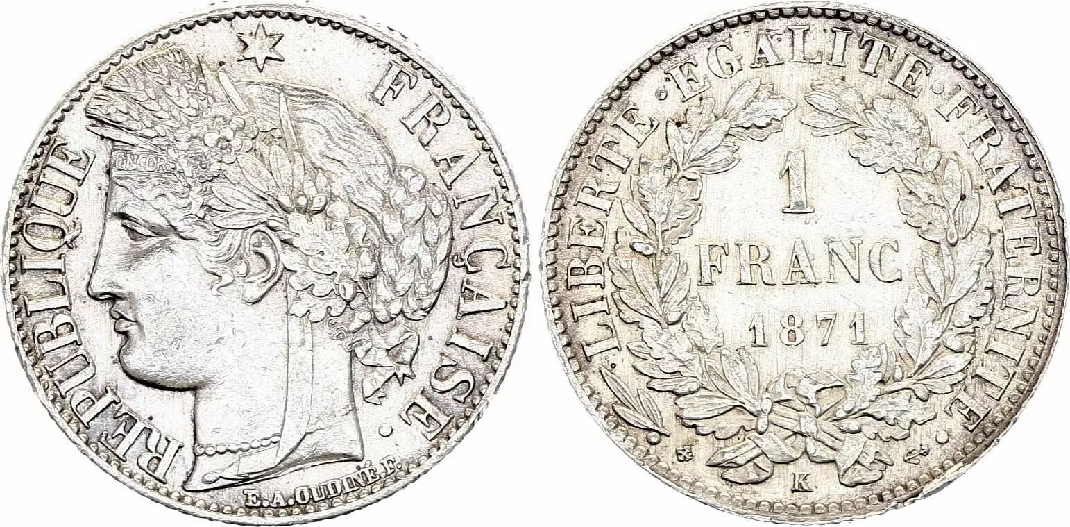 Coin France 1 Franc Ceres - Gouvernement National -1871 K Bordeaux