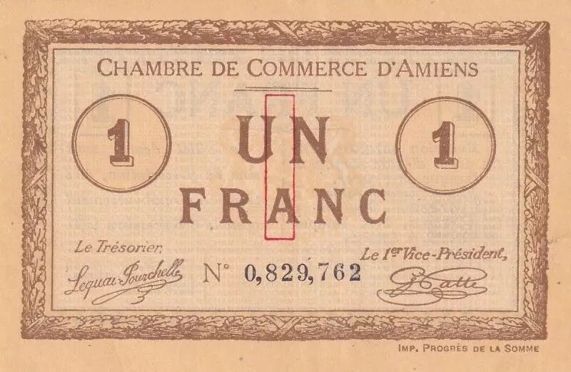 The banknote does not have a watermark. It was printed by the Imprimerie du Progrès de la Somme.