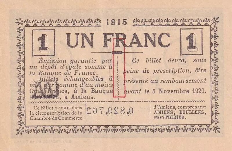 This 1 franc banknote was issued in 1915 by the Amiens Chamber of Commerce. It bears the serial number N 0 829 762 and features inscriptions in Latin.
