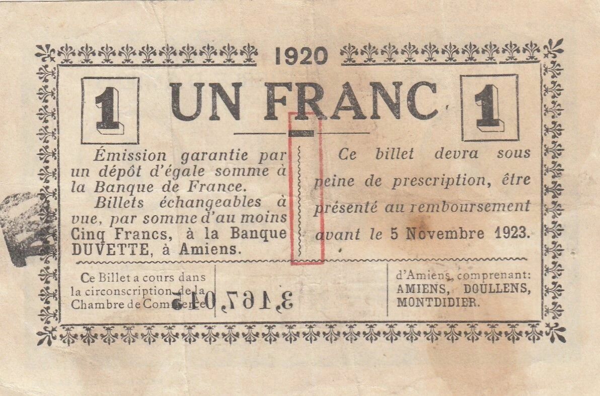 The 1 Franc banknote issued by the Amiens Chamber of Commerce in 1920 represents an example of the French emergency issues produced during and immediately after the First World War.