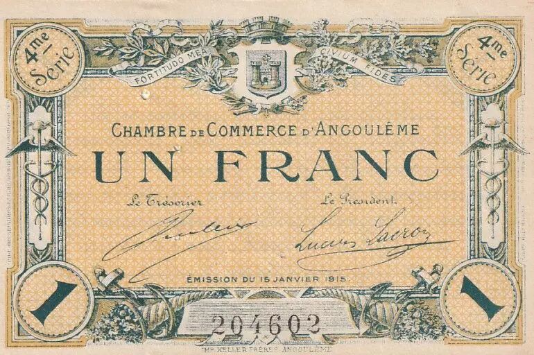 This 1 franc banknote was issued in 1915 by the Angoulême Chamber of Commerce. It is a type of emergency currency issued during the First World War to alleviate the shortage of coinage.