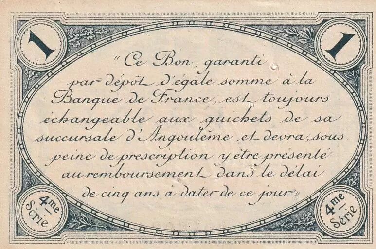 The reverse of the banknote bears the inscription "Ce Bon garantie par Dépôt d'égal somme à la Banque de France est toujours échangeable aux guichets de sa succursale d?Angoulême et devra sous peine de prescription y être présenté au remboursement dans le délai de cinq ans à dater de ce jour." This indicates that the banknote is guaranteed by a deposit equivalent to the Bank of France and exchangeable at its Angoulême branch, with a reimbursement deadline of five years. The value "1" is repeated twice on this side, on either side of the text. The inscription "4me série" is also repeated twice.