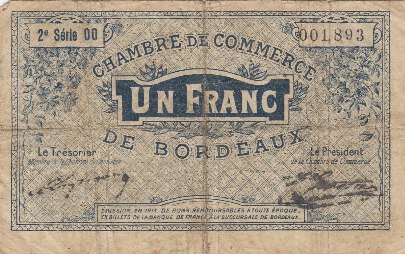 Home > French Banknotes > Necessity Money (1789-1945) > 1914-1925 Chamber of Commerce > France 1 Franc - Chamber of Commerce - Bordeaux - 1914