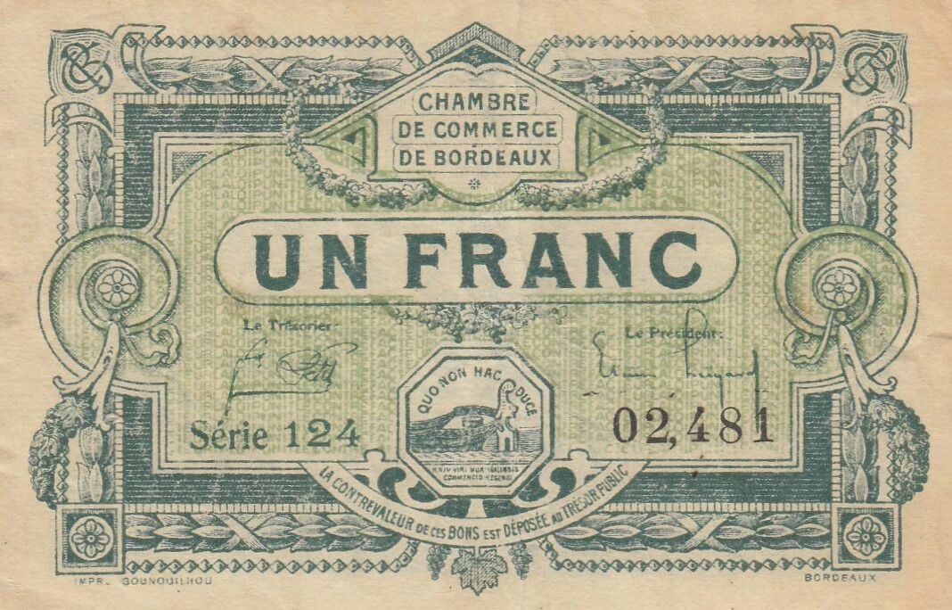Home > French Banknotes > Necessity Money (1789-1945) > 1914-1925 Chamber of Commerce > France 1 Franc - Chamber of Commerce - Bordeaux - 1920