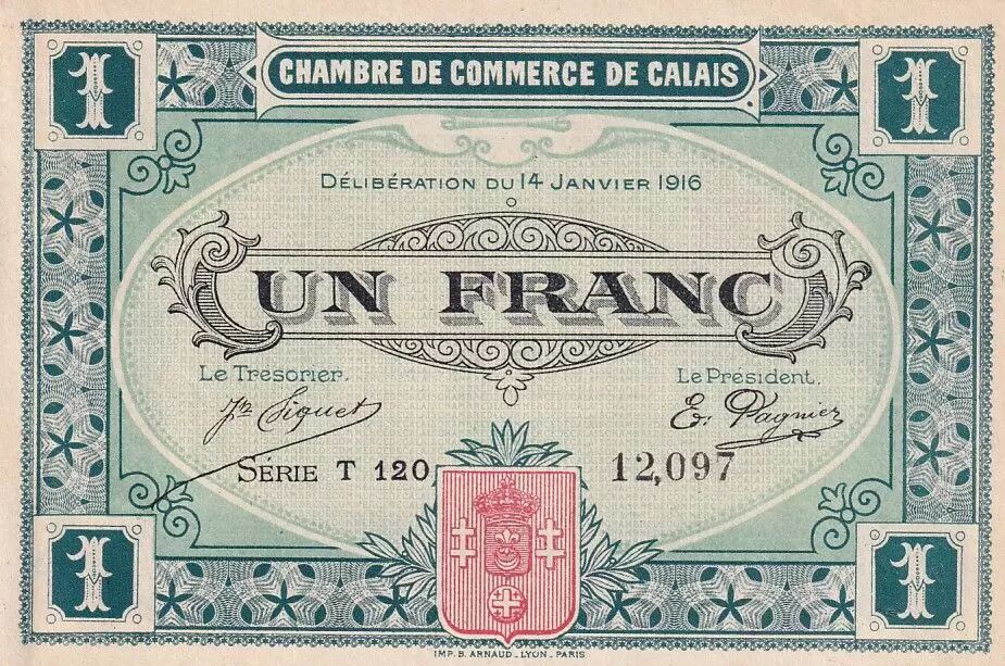 The 1 Franc banknote issued by the Calais Chamber of Commerce in 1916 represents a testimony of French monetary history during the First World War. This emergency banknote, designed to alleviate the shortage of metallic currency, displays on its obverse the face value "1" in numerals, accompanied by the mention "CHAMBRE DE COMMERCE DE CALAIS". It also includes the indication "UN FRANC", as well as the functions of the Treasurer and the President, without indication of their names. The printer's signature, "IMP. B. ARNAUD LYON - PARIS", is also present.