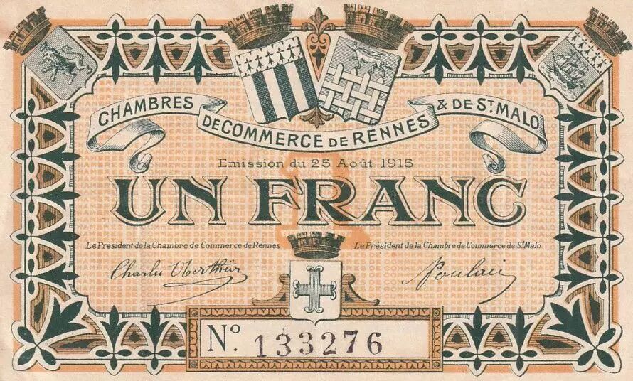 This 1 Franc banknote was issued in 1915 by the Chambers of Commerce of Rennes and Saint-Malo. It is a special issue intended to facilitate trade in the districts of these two cities.