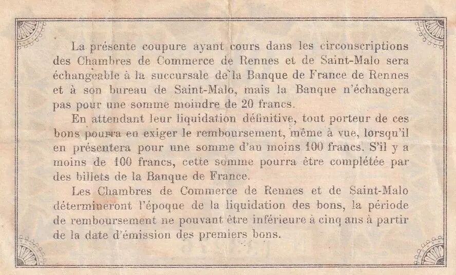 The reverse of the banknote consists of a double frame with a quarter wheel at each corner. The inscriptions on the back specify the conditions for exchanging the banknote: "The present coupon being valid in the districts of the Chambers of Commerce of Rennes and Saint-Malo will be exchangeable at the branch of the Banque de France in Rennes and its office in Saint-Malo, but the bank will not exchange for a sum less than 20 francs." It is also indicated that "any holder of these vouchers may demand reimbursement, even at sight, when they present them for a sum of at least 100 francs." The Chambers of Commerce of Rennes and Saint-Malo will determine the time for the liquidation of the vouchers, with a repayment period not less than five years from the date of issue.