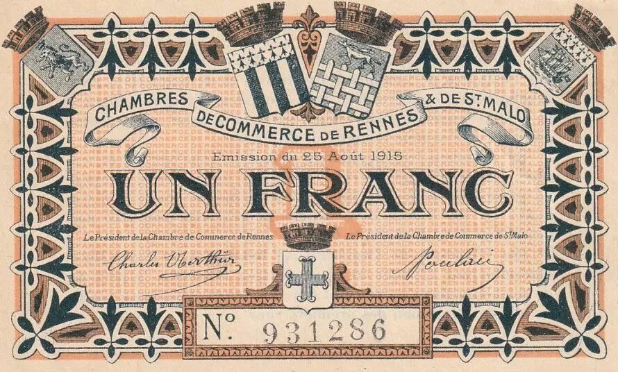 This 1 Franc banknote was issued in 1915 by the Chambers of Commerce of Rennes and Saint-Malo. It is a special issue intended to facilitate trade within the districts of these two cities.