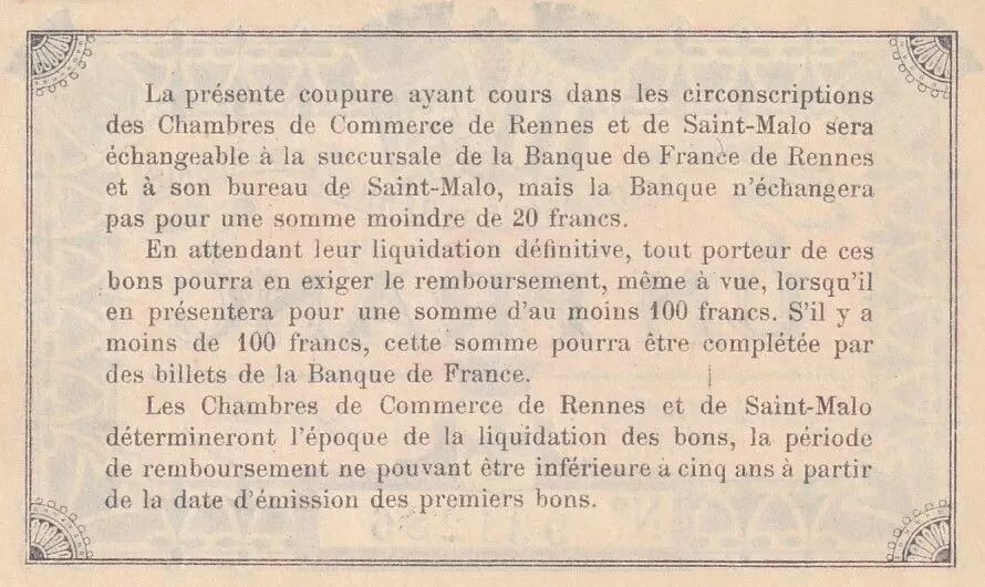 The back of the banknote consists of a double frame with a quarter of a wheel in each corner. The inscriptions on the back specify the conditions for exchanging the banknote: "La présente coupure ayant cours dans les circonscriptions des Chambres de Commerce de Rennes et de Saint-Malo sera échangeable à la succursale de la Banque de France de Rennes et à son bureau de Saint-Malo, mais la banque n'échangera pas pour une somme moindre de 20 francs." It is also indicated that "tout porteur de ces bons pourra en exiger le remboursement, même à vue, lorsqu'il en présentera pour une somme d'au moins 100 francs." The Chambers of Commerce of Rennes and Saint-Malo will determine the time of liquidation of the bonds, with a repayment period not less than five years from the date of issue.