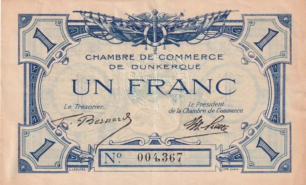 This banknote, with a face value of one franc, was issued by the Chamber of Commerce of Dunkirk. It is a type of paper money issued locally in France by an institution other than the Banque de France.