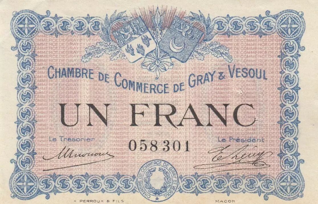 Home > French Banknotes > Necessity Money (1789-1945) > 1914-1925 Chamber of Commerce > France 1 Franc - Chamber of commerce - Gray and Vesoul - 04-10-1915 - Serial 058