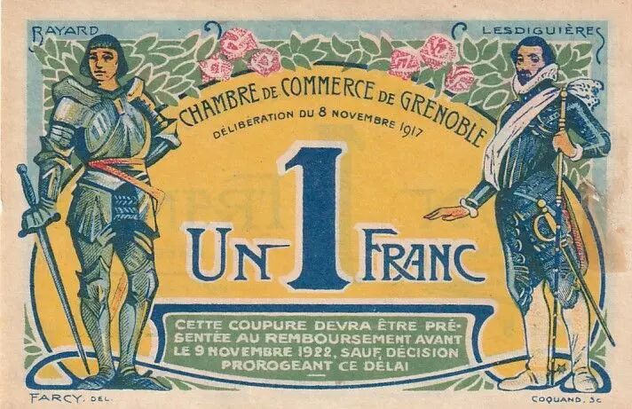 The 1 Franc banknote issued by the Grenoble Chamber of Commerce in 1917 is a testament to French economic history during World War I. This banknote does not have a watermark.