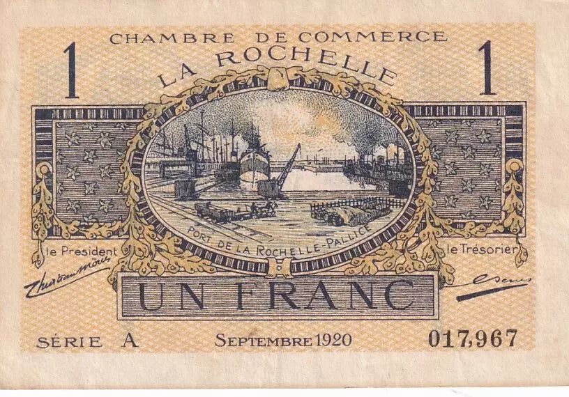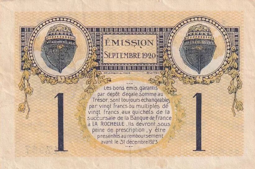 This 1 franc banknote, issued by the La Rochelle Chamber of Commerce, dates from September 1920 and belongs to Series A. It is a bond issued, guaranteed by a deposit of equal amount in the Treasury, and exchangeable in denominations of twenty francs or multiples of twenty francs at the branch of the Banque de France in La Rochelle. It was imperative to present it for redemption before December 31, 1923, under penalty of prescription.