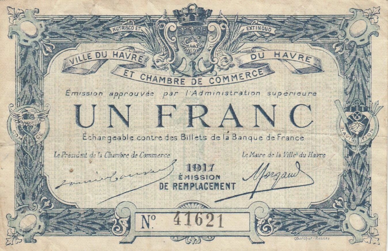 The 1 Franc banknote issued by the Le Havre Chamber of Commerce in 1917 is a testament to French local monetary history during the First World War.