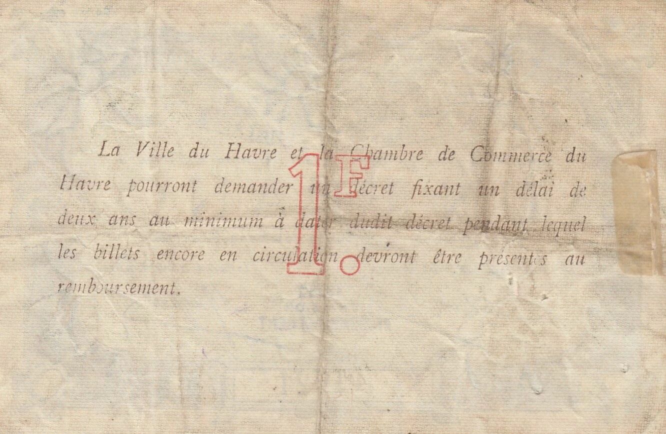 The obverse of the banknote features textual inscriptions indicating the issuer, namely the Le Havre Chamber of Commerce, as well as the face value of 1 Franc. The date of issue, 1917, is also mentioned. Ornamental graphic elements, typical of the time, frame this information.