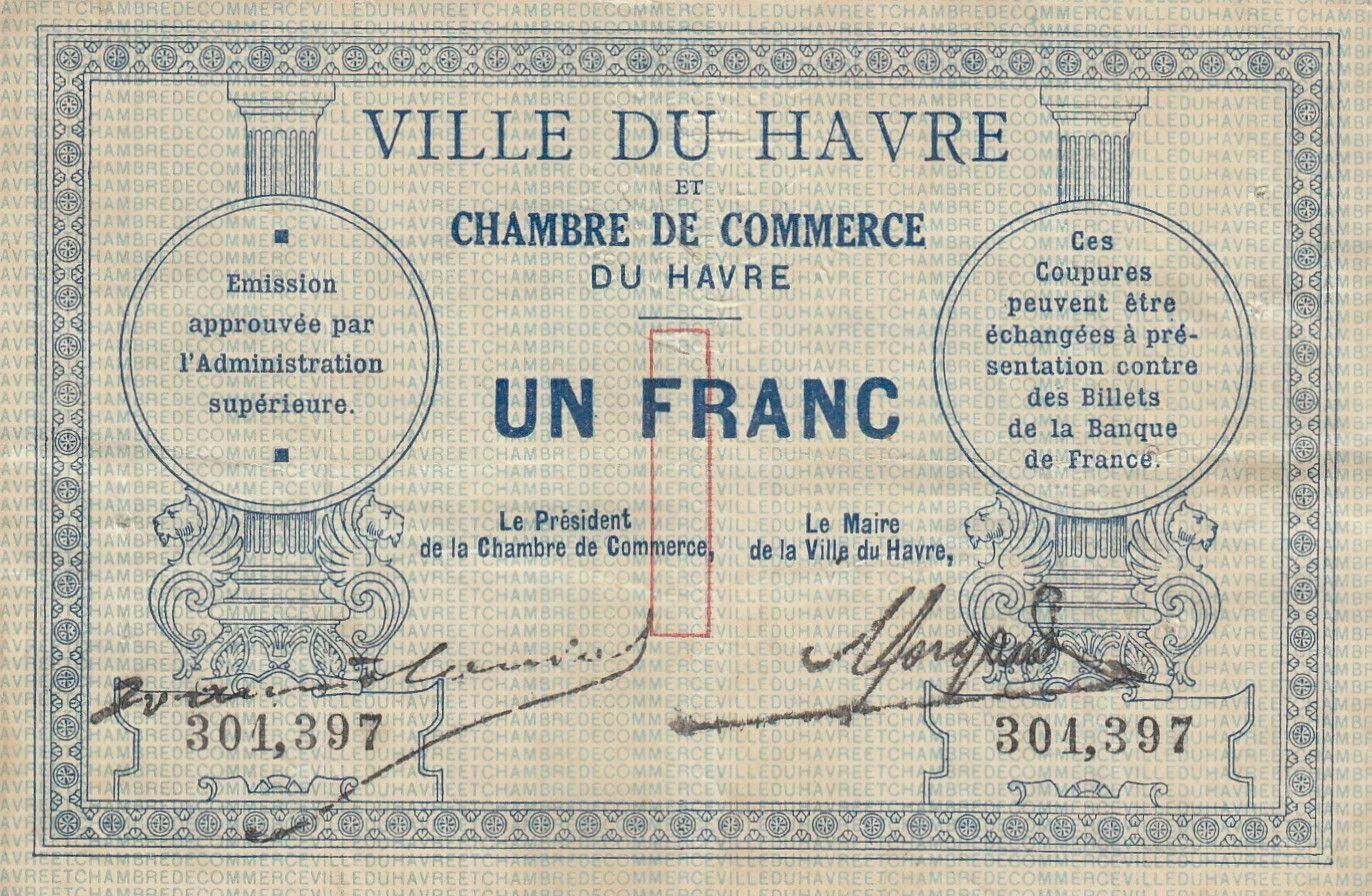 The obverse of the banknote features various textual inscriptions. It includes the mention of the "Chamber of Commerce of Le Havre", as well as the face value "1 Franc". The banknote's number is also printed on the obverse. The date of issue is not systematically present on all banknotes, but it may appear in some versions.