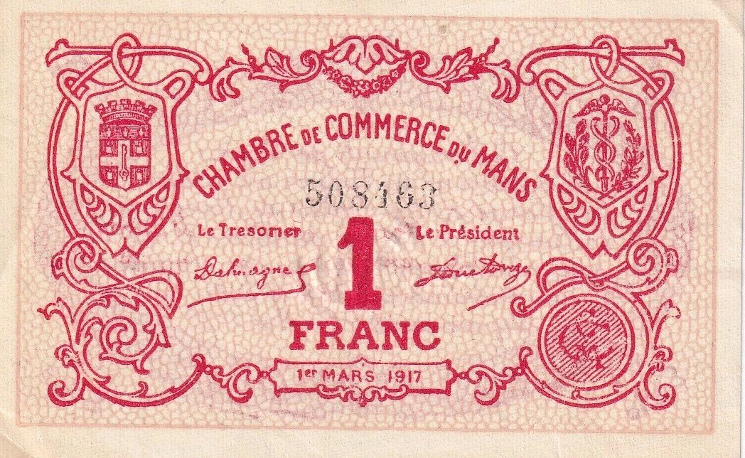 This 1 franc banknote was issued by the Chamber of Commerce of Le Mans, dated March 1, 1917, and belongs to the 2nd series. It is a voucher guaranteed by a deposit of an equal sum at the Treasury.