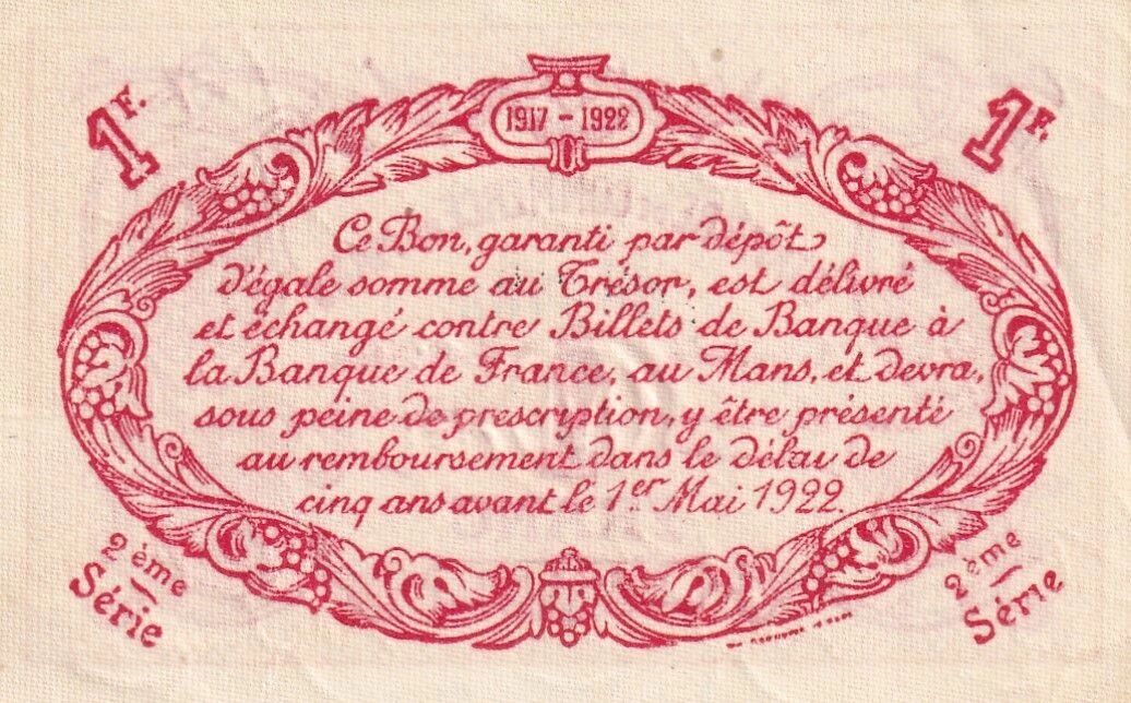 The reverse of the banknote bears the face value "1f 1f" repeated in the upper left and upper right corners. The validity period of the banknote is specified: "1917 - 1922". An important clause stipulates that this voucher is guaranteed by a deposit of an equal sum at the Treasury and that it is exchangeable for banknotes at the Banque de France, in Le Mans. The banknote had to be presented for reimbursement within five years before May 1, 1922, under penalty of prescription. The mention "2ème Série 2ème Série" is repeated. The printer, "IMP. MONNOYER LE MANS", is also mentioned.