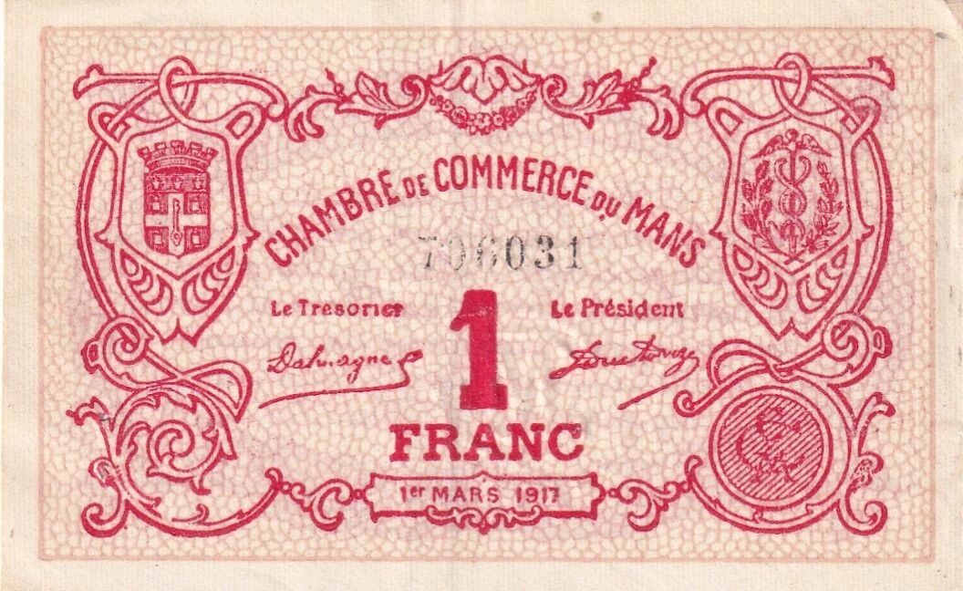 This 1 Franc note issued by the Le Mans Chamber of Commerce, dated March 1, 1917, belongs to the 2nd series of this issue. The front of the note features the inscriptions "CHAMBRE DE COMMERCE DU MANS", a seven-digit serial number (706031), the mentions "Le Trésorier" (The Treasurer) and "Le Président" (The President), as well as the face value "1 FRANC".