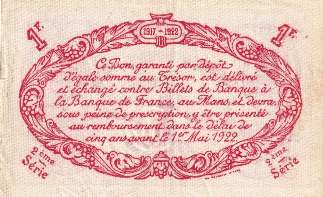 On the back, the face value "1f" is repeated twice, as well as the validity period of the note "1917 - 1922". An inscription specifies that this voucher is guaranteed by a deposit of an equivalent sum at the Treasury and that it is exchangeable for banknotes at the Banque de France in Le Mans. It is also stipulated that the note must be presented for redemption within five years before May 1, 1922, under penalty of prescription. The mention "1ère Série 1ère Série" (1st Series 1st Series) also appears on the back.