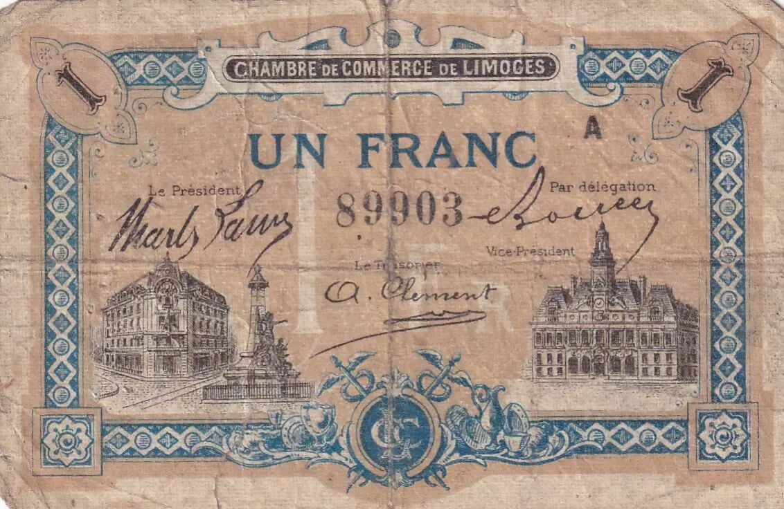 On the front, you can read "CHAMBRE DE COMMERCE DE LIMOGES", followed by the serial number "89903". The mention "Série A" identifies the series of issue. The nominal value "UN FRANC" is clearly indicated, accompanied by the signatures of the President and Treasurer of the Chamber of Commerce.