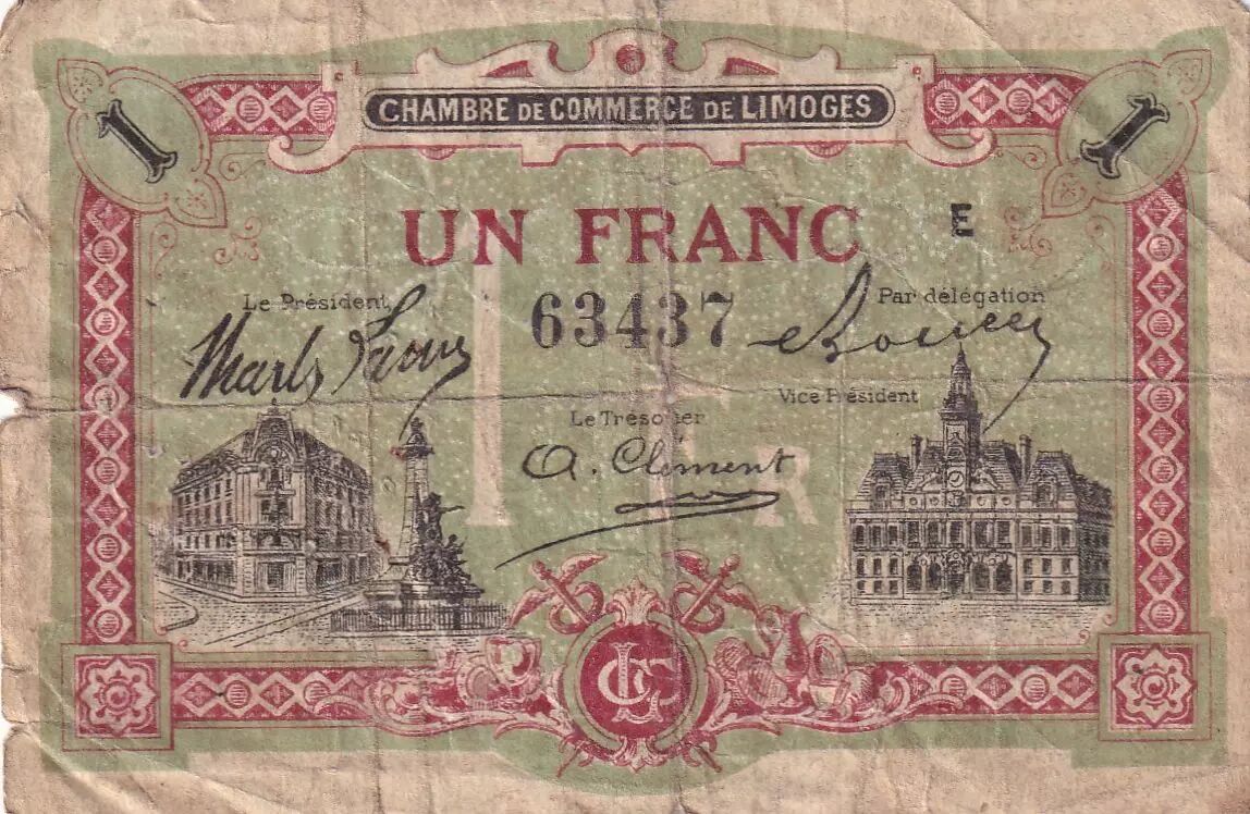 On the front, the inscription "CHAMBRE DE COMMERCE DE LIMOGES" in capital letters identifies the issuing institution. A serial number, "63437", is printed, followed by the mention "Série E". The face value, "UN FRANC", is clearly indicated. The roles of the President and Treasurer are mentioned, highlighting the responsibility of the signatories. The writing is in Latin.