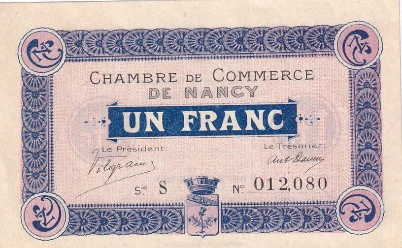On the front of the banknote, one can read the inscription "CHAMBRE DE COMMERCE DE NANCY" in capital letters, indicating the issuer of the banknote. The face value, "UN FRANC", is also mentioned. The banknote bears the serial number "S N° 012.080", each banknote being unique by its serial number. The script used is Latin, the administrative language of the time.