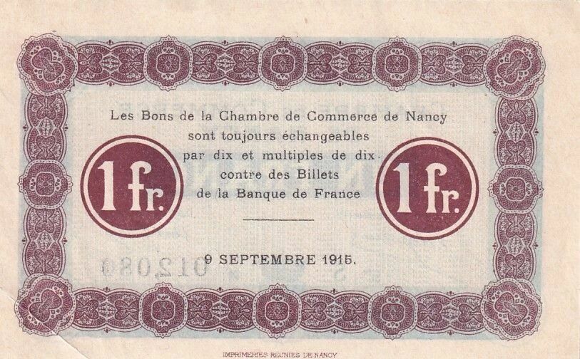 The 1 Franc banknote issued by the Nancy Chamber of Commerce, dated 09-09-1915, represents an example of emergency money issued during a time of conflict. This type of banknote was produced to alleviate the shortage of cash during the First World War.
