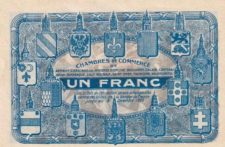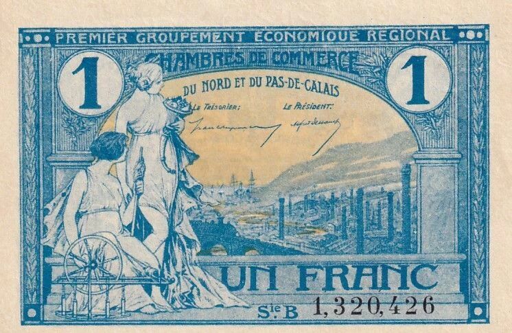 This 1 franc note was issued in 1917 by the Chambers of Commerce of the Nord and Pas-de-Calais regions, belonging to Series B. It is a local issue intended to facilitate economic exchanges during a period marked by the difficulties of World War I.