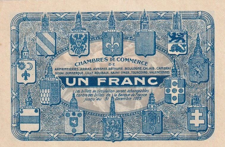 This 1 franc banknote was issued in 1917 by the Chambers of Commerce of Nord and Pas-de-Calais, it belongs to Series B. It is an emergency issue, intended to compensate for the lack of cash during the First World War.