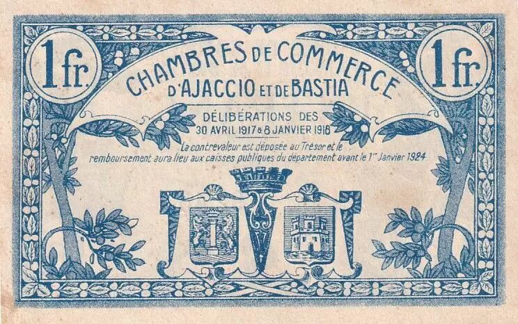 Ce billet de un franc a été émis par les Chambres de Commerce d'Ajaccio et de Bastia. Les délibérations concernant son émission datent du 30 avril 1917 et du 8 janvier 1918. Il appartient à la série B.