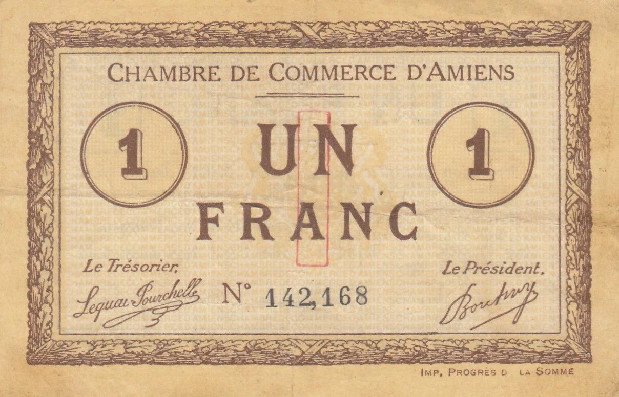 Le billet de 1 franc émis par la Chambre de Commerce d'Amiens en 1915 représente une forme de monnaie de nécessité émise en période de conflit. Ce type de billet a été produit pour pallier le manque de monnaie divisionnaire en circulation pendant la Première Guerre mondiale.