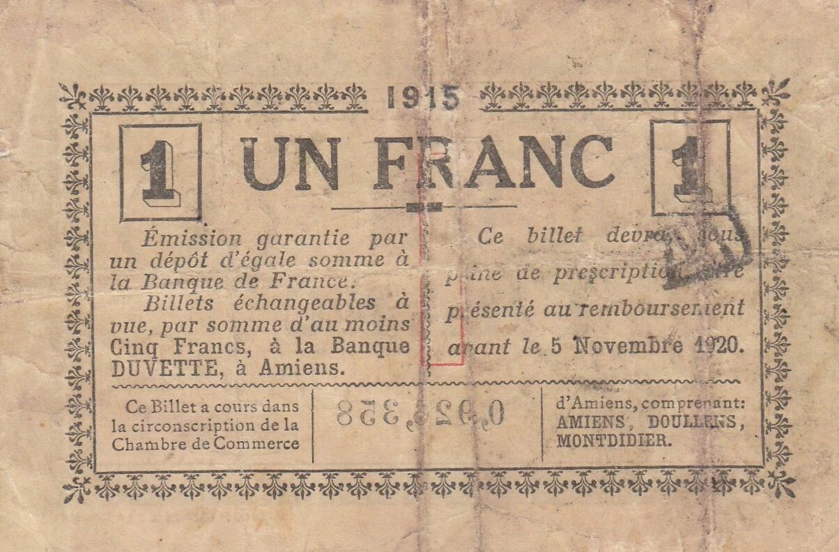 Le billet de 1 franc émis par la Chambre de Commerce d'Amiens en 1915 représente une forme de monnaie de nécessité émise en période de conflit. Ce type de billet a été produit pour pallier le manque de monnaie divisionnaire en circulation pendant la Première Guerre mondiale.