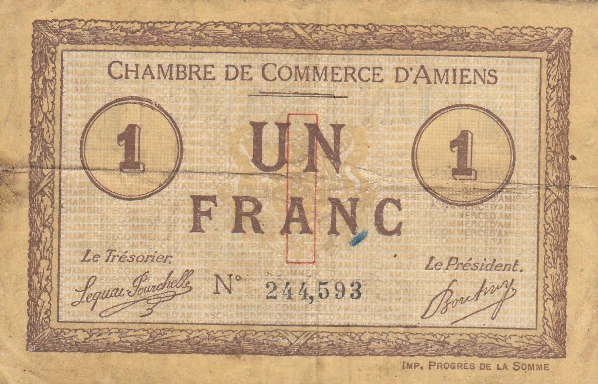 Le billet de 1 franc émis par la Chambre de Commerce d'Amiens en 1915 représente une forme de monnaie de nécessité émise en période de conflit. Ce type de billet a été produit pour pallier le manque de monnaie divisionnaire en circulation pendant la Première Guerre mondiale.